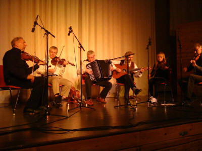 hardingfele til kulturkveldane. 9-10 spelemenn, med Sjumann Askvik i spissen,